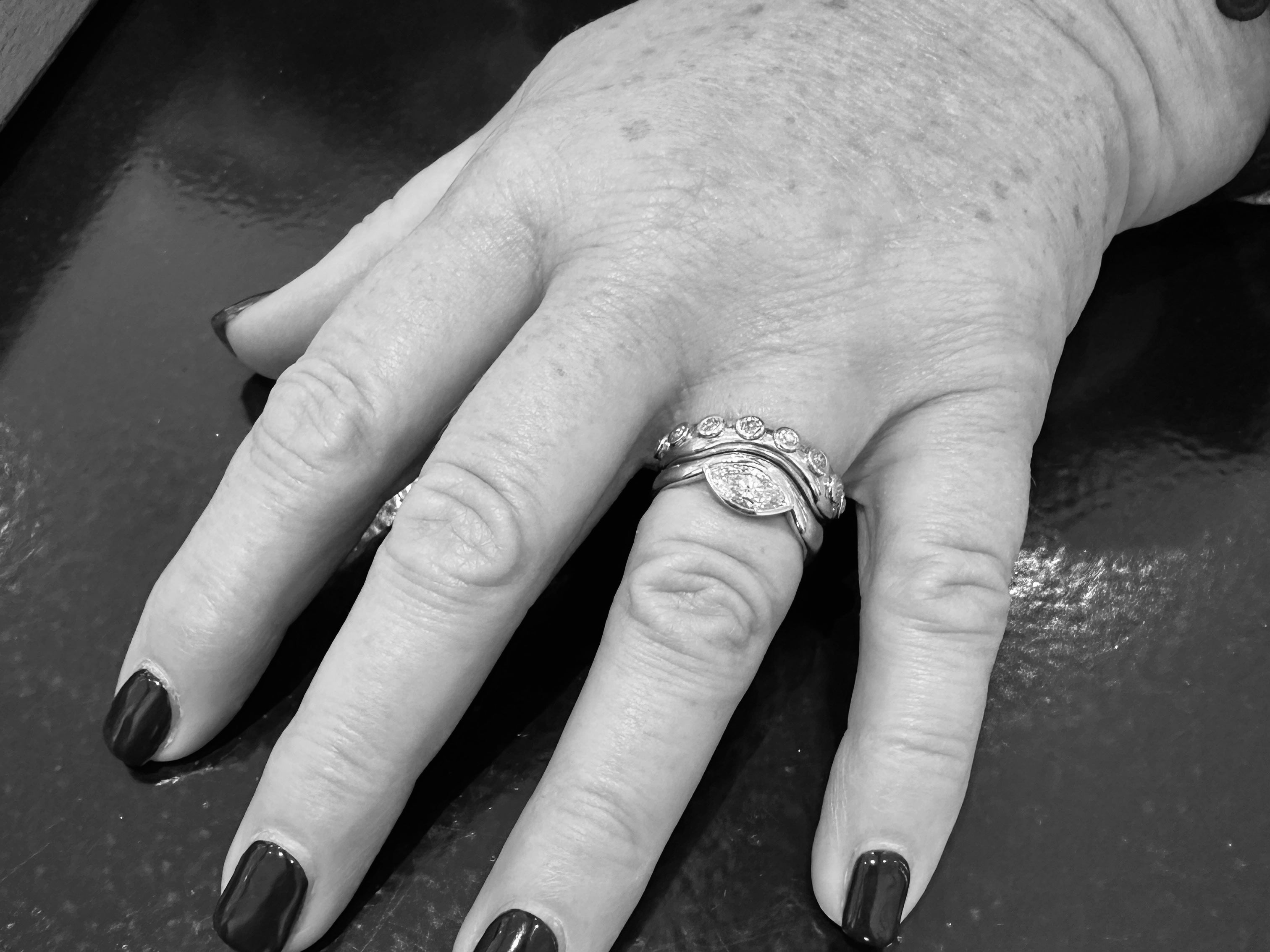 Fe wnaethon ni drawsnewid casgliad o 19 o ddiamwntau yn set drawiadol o fodrwyau arian wedi'u pentyrru, pob carreg wedi'i sicrhau mewn lleoliad rhwbiwr amserol. Crëwyd modrwy aur ganolog fel darn nodwedd, gan ychwanegu cynhesrwydd a chyferbyniad i'r bandiau arian disglair. Wedi'i chynllunio i'w gwisgo gyda'i gilydd neu ar wahân, mae'r set fodern ond sentimental hon yn dathlu oes o atgofion mewn ffordd feiddgar a hardd.